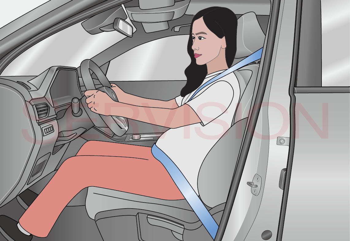 整个怀孕期间,孕妇应正确佩戴胯-肩式安全带。肩带应从合适的位置通过胸部。胯带应尽可能低地通过胯部,贴合在“隆起的”腹部下方。安全带必须平展,对孕妇下身无压迫。