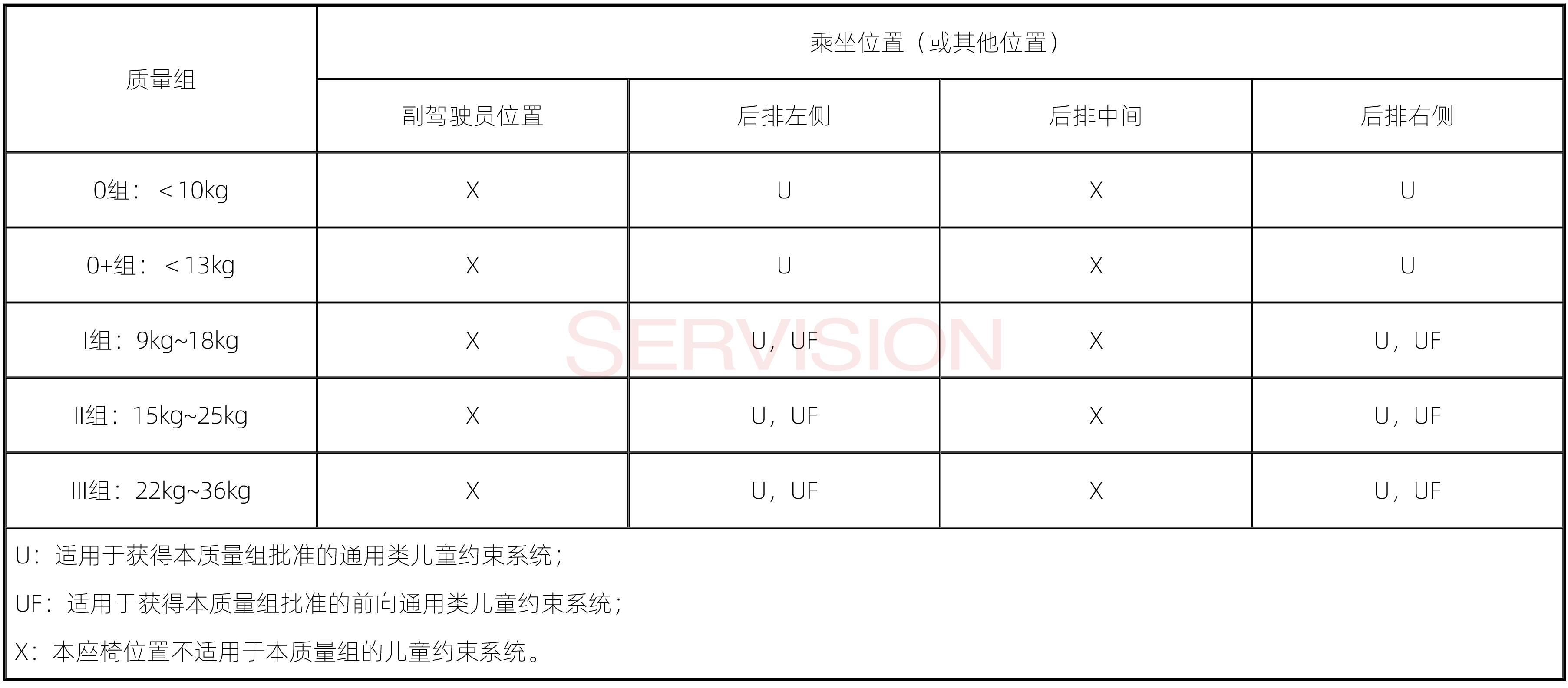 不同乘坐位置对儿童座椅的适用性信息