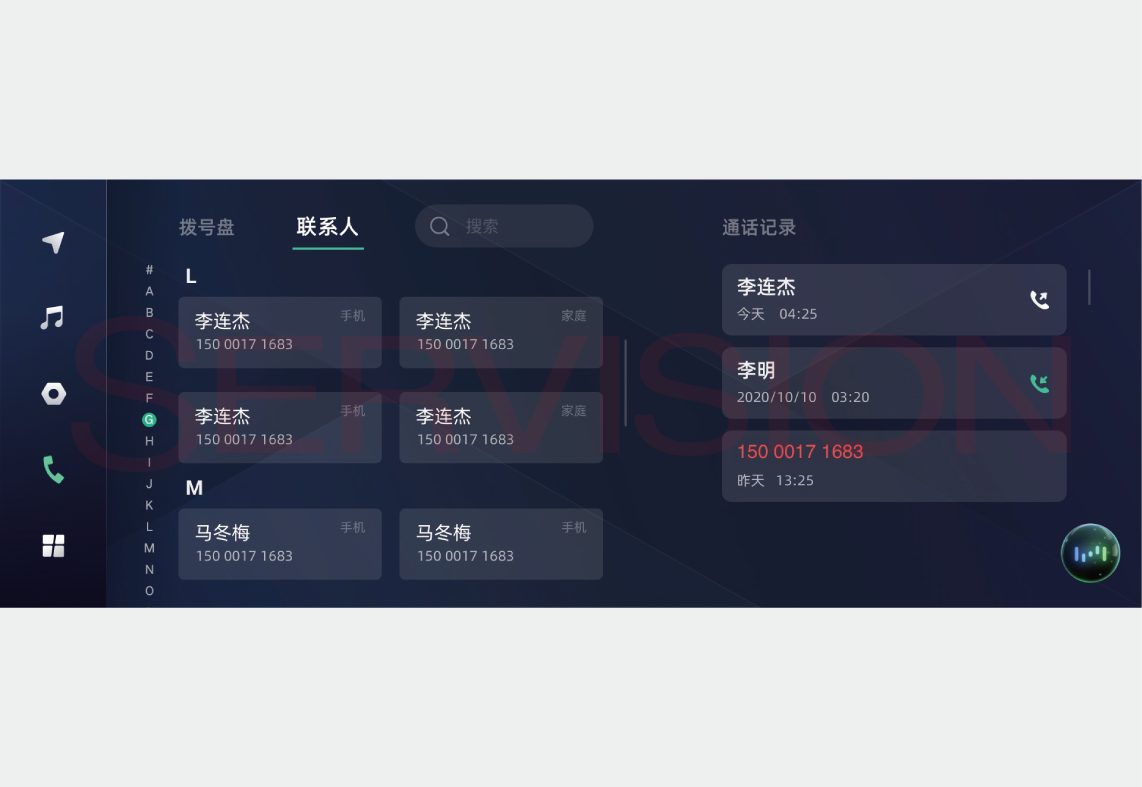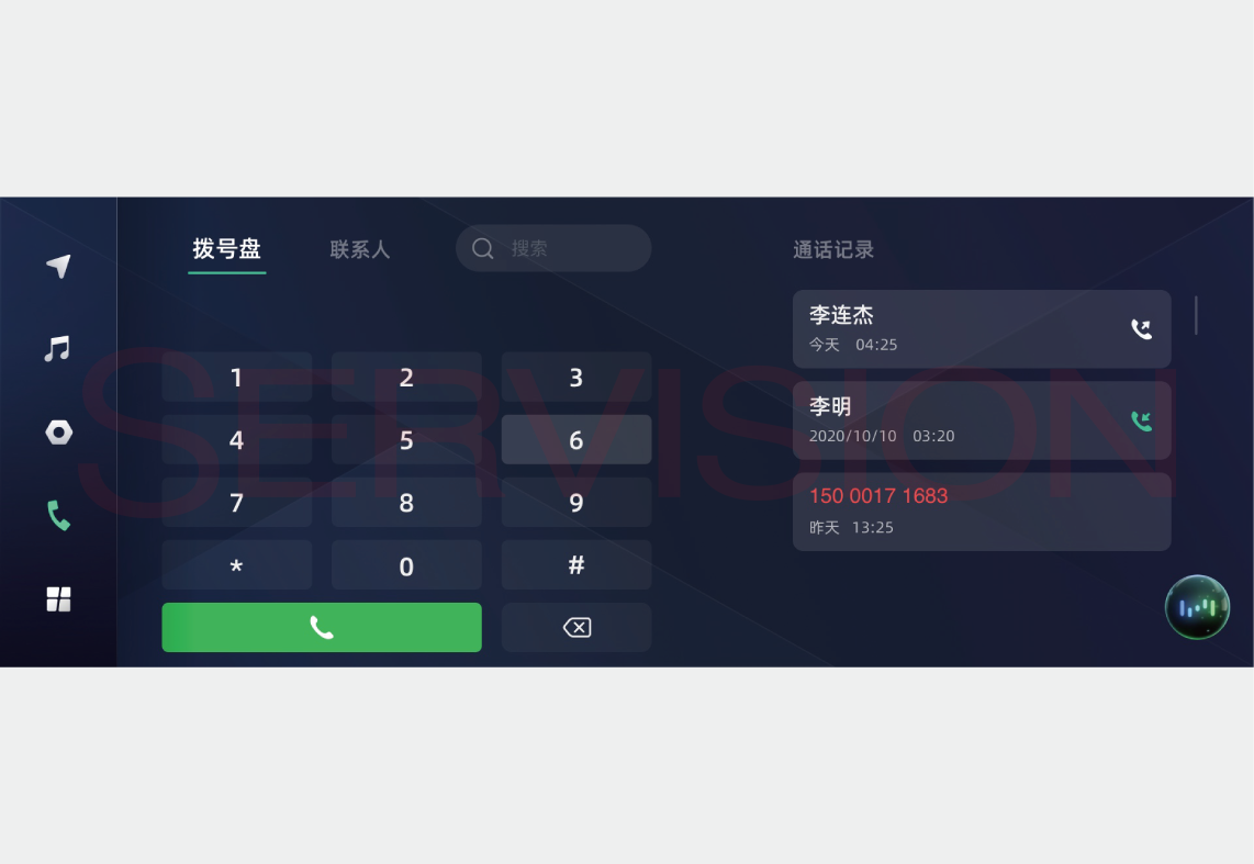 在多媒体显示屏中点击进入电话菜单,进入拨打电话界面,显示拨号盘和通话记录。